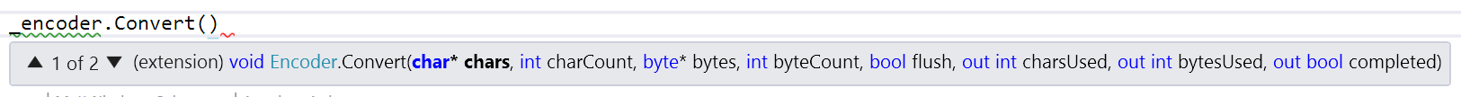 var method = Encoding.UTF8.GetEncoder().GetType().GetRuntimeMethod("Convert", parameterSignature);